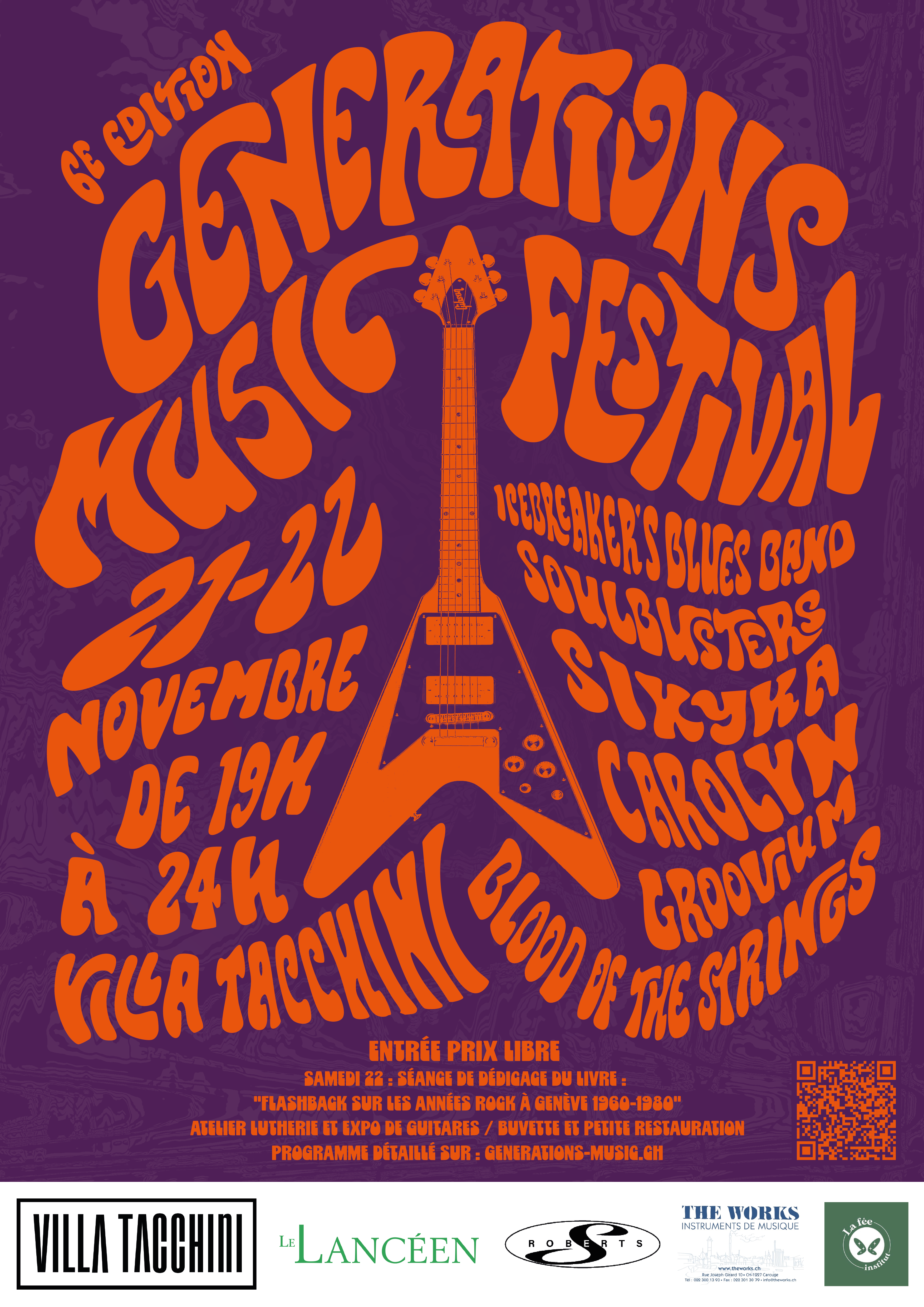 Voici la nouvelle affiche du Festival Générations Music avec au programme des groupes locaux et une Jam session le samedi pour clore cette très belle 5e édition. Ça sera à la Villa Tacchini dès 18h les 24 et 25 novembre 2023. Alors réservez votre soirée et venez découvrir ces talentueux artistes genevois. Prix libre, petite restauration, merchandising des groupes et du festival, bières locales, …